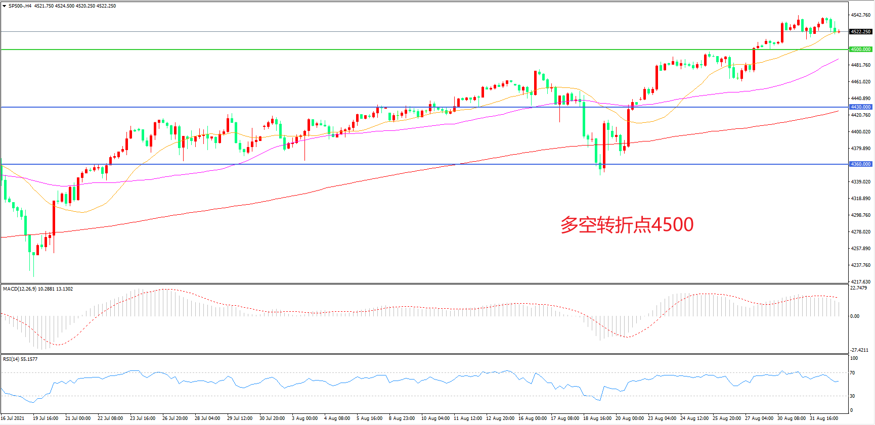 4小时图看,标普500连续拉升后延续高位震荡,整体表现偏强,均线系统呈多头排列,4500成为短期多空分水岭,MACD红柱增加,RSI指标走平,日内震荡上行概率较大。