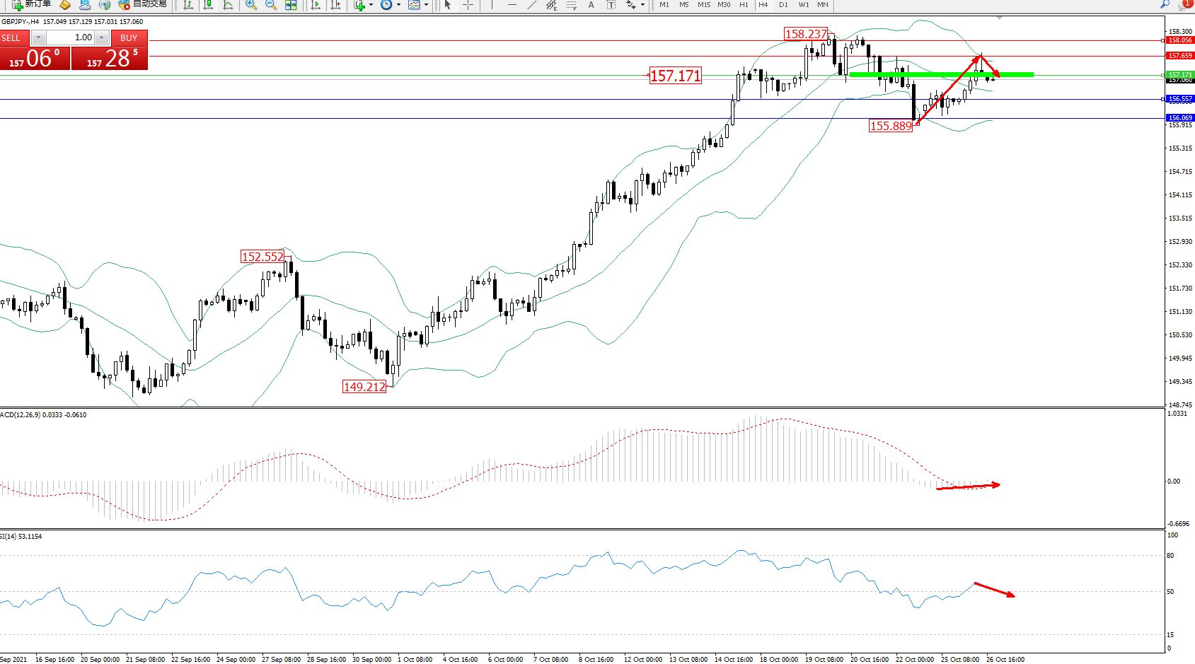 交易策略:157.171下方看跌,目标156.557、156.069