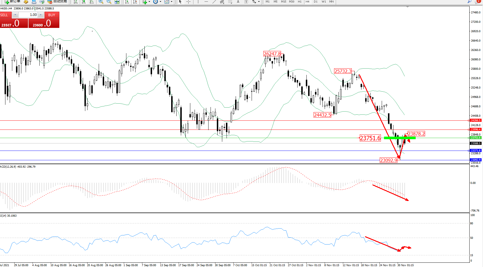 恒指HK50 ——4小时K线图显示: