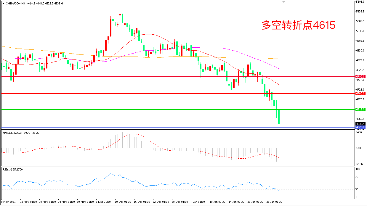 4小时图看,沪深300长阴连续下破,短期走势偏空,均线系统呈空头排列, 4615成为多空分水岭, MACD绿柱增加,RSI指标走平,日内震荡下行概率较大。