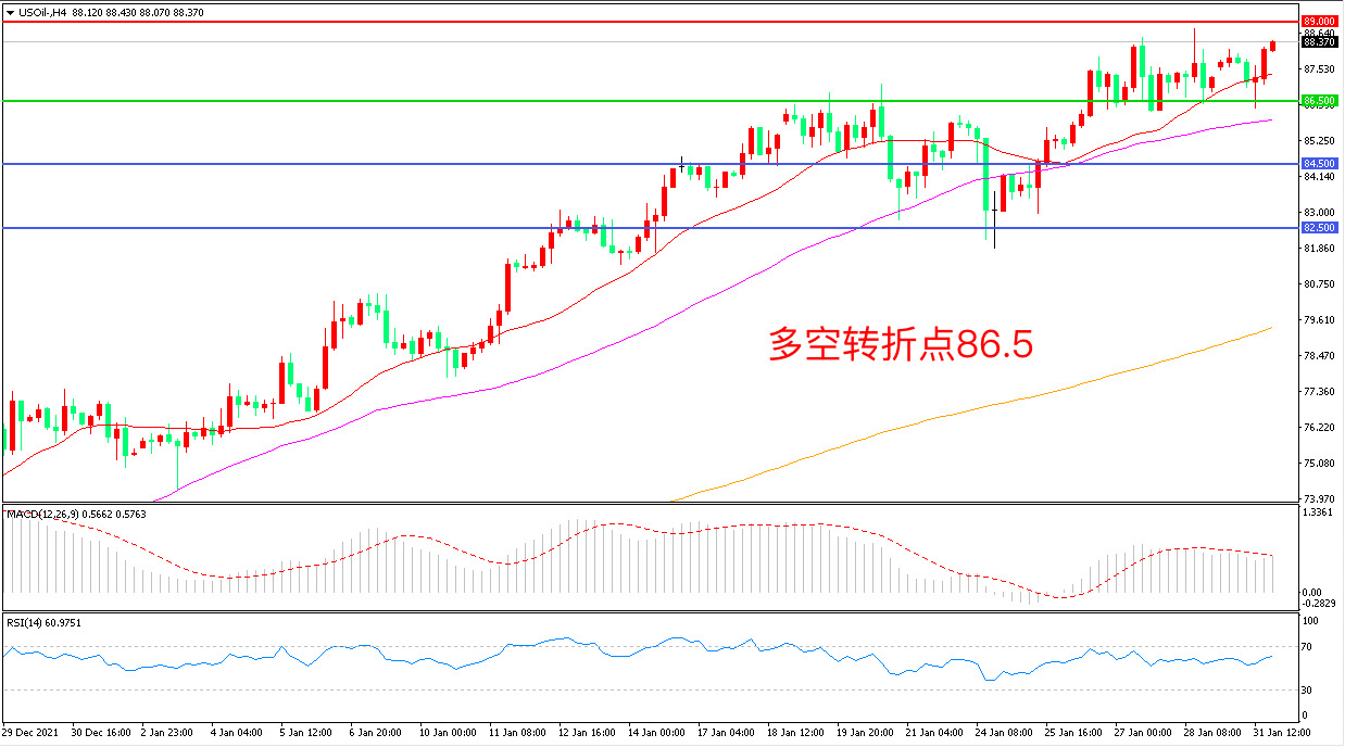 交易策略:在86.50之上看涨,目标89..00        92.00
