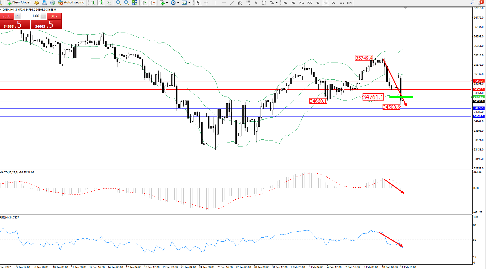 技术点评:空头动力维持震荡下行,跌破布林带指标下轨至34508附近节点后短期整理,空头动力有继续下行态势,短期下行未见有止步迹象,布林带指标呈缓慢张口走势持续中,MACD指标空头动力维持震荡下行至0轴线下侧徘徊,RSI指标处于50均衡线下侧维持震荡下行中;