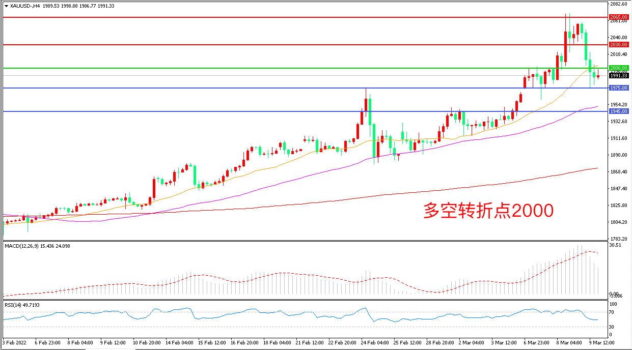 周三(3月9日),乌克兰执政党发表声明,乌克兰不可能在未来几年加入北约,俄罗斯也表示特别行动的目的不包括推翻乌克兰政府,市场避险情绪回落导致金价“跳水”,收报1991.33美元/盎司。受地缘政治局面影响,黄金近期波动非常大,如果俄罗斯和乌克兰的紧张局势继续持续,那么黄金的涨势仍可能找到更多支撑。