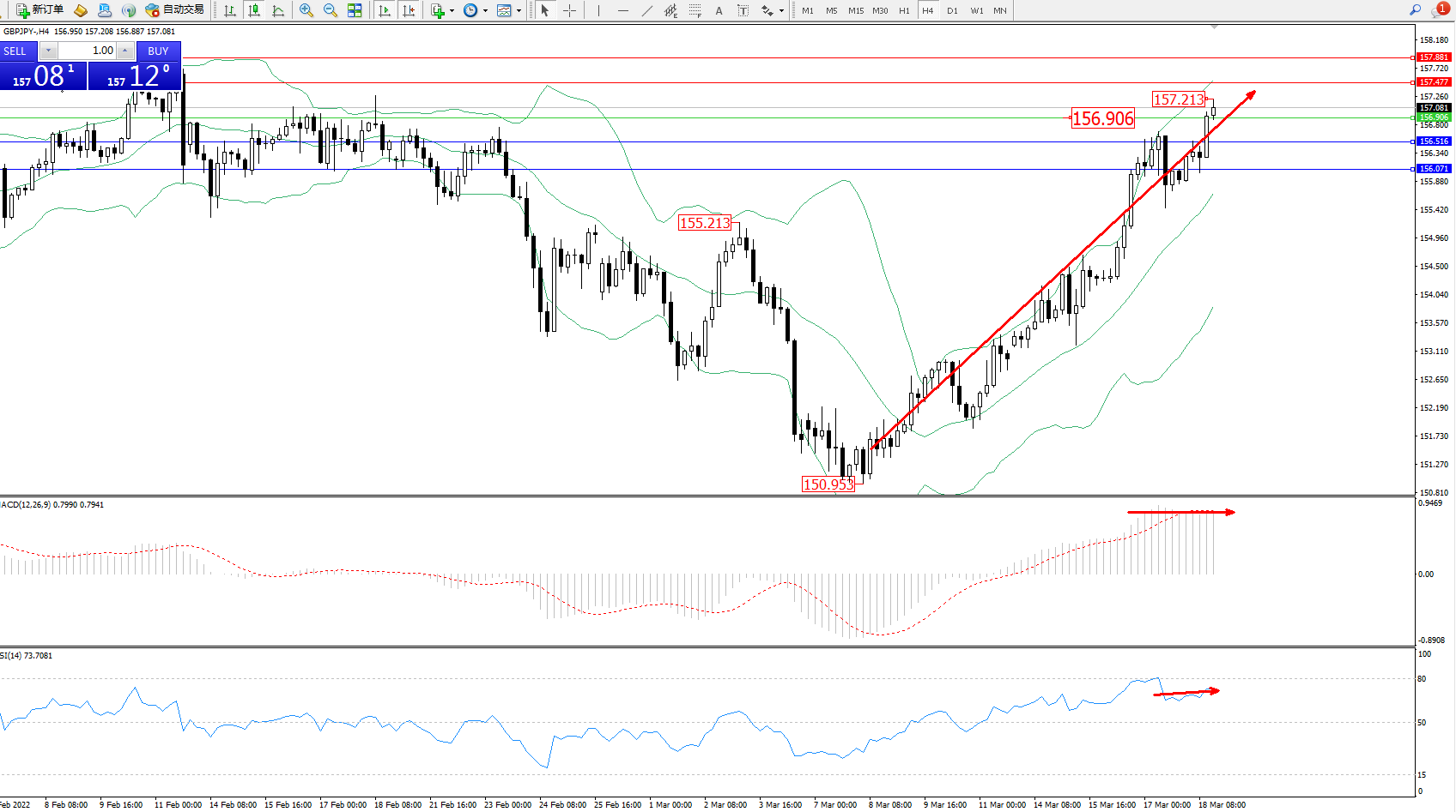 备选策略:156.906下方看跌,目标156.516、156.071