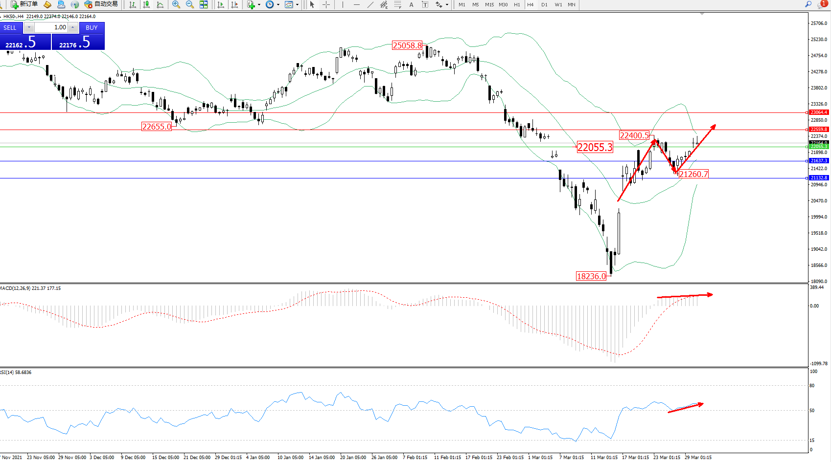 交易策略:22055上方看涨,目标22559、23064