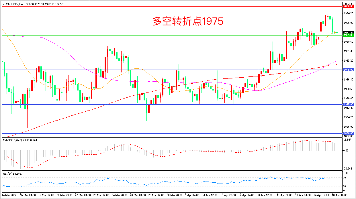 周一(4月18日),随着俄乌冲突持续、欧美对俄罗斯能源制裁等,大宗商品的价格不断走高,美联储为对抗通胀被迫加快收水引发市场对经济衰退的担忧,现货黄金一度大幅上涨后冲高回落,收报1977.63美元/盎司。在美国的通胀水平正面临逾四十年新高之际,黄金作为对冲通胀加速的避险资产,市场对其需求上升,重点关注本周美联储官员的讲话。