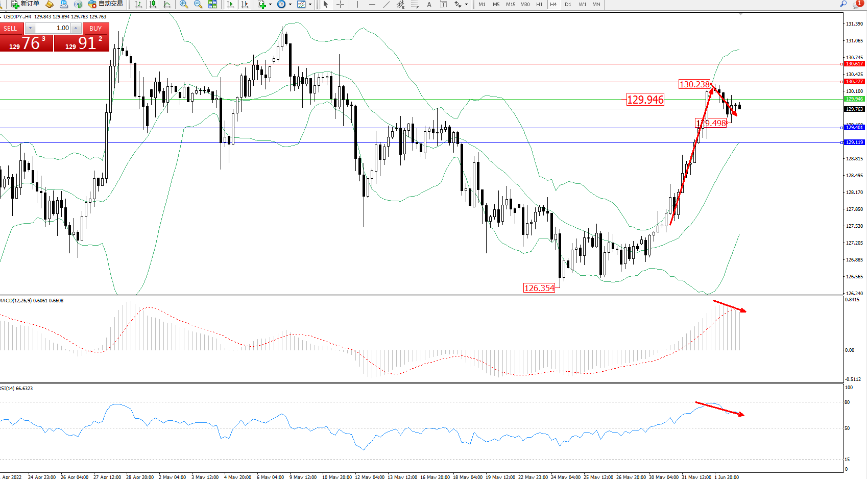 交易策略:129.946下方看跌,目标129.401、129.119