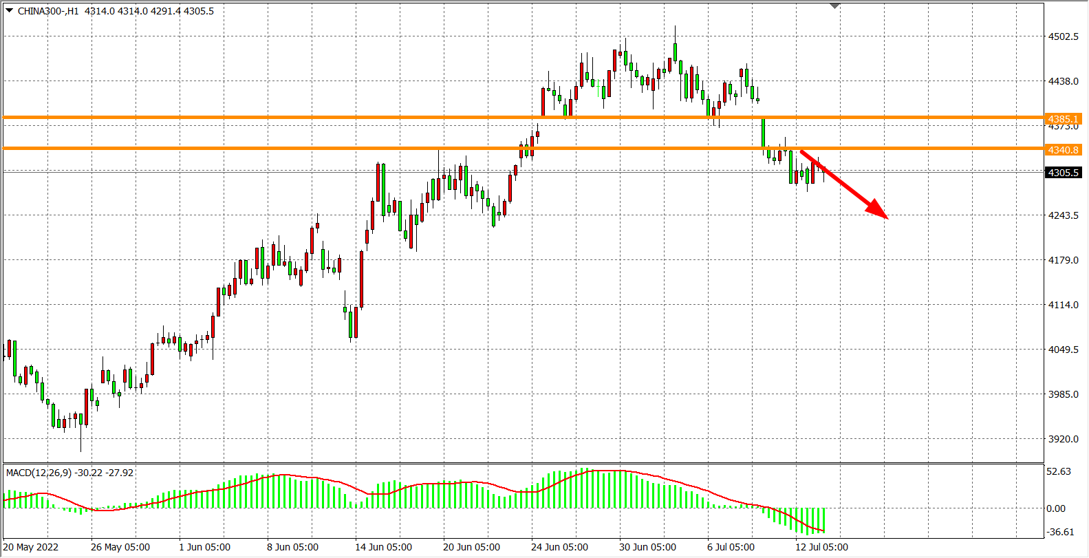 1小时图看,沪深300窄幅盘整,目前阻力已下移至4340,MACD于零轴之下开始放量,短线趋势顶部初现,行情走弱明显,日内在4340之下继续看回调,下方看4250-4200