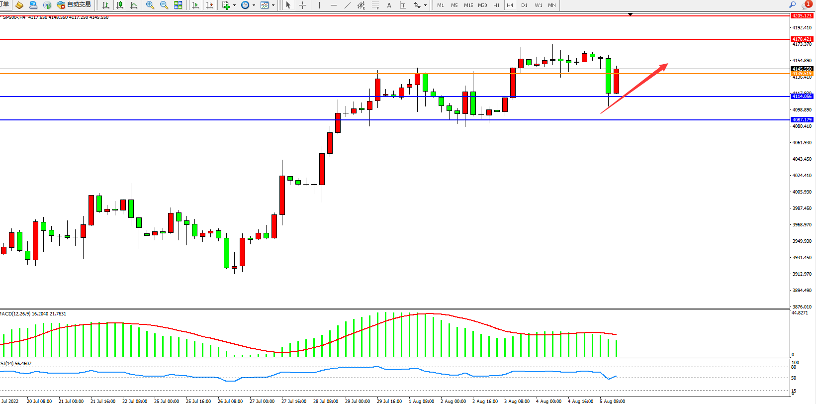 标普500指数8月5日(周五)收盘下跌7.64点,跌幅0.18%,报4144.30点;美国7月非农就业人数是预期的两倍多,表明就业需求非常旺盛,尤其是在劳动力短缺的服务业,缓解了人们对经济衰退的担忧。