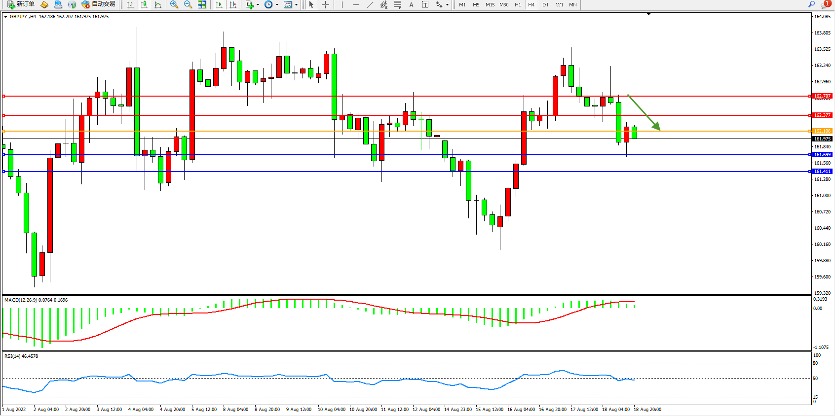 交易策略:162.106下方看跌,目标161.699、161.411