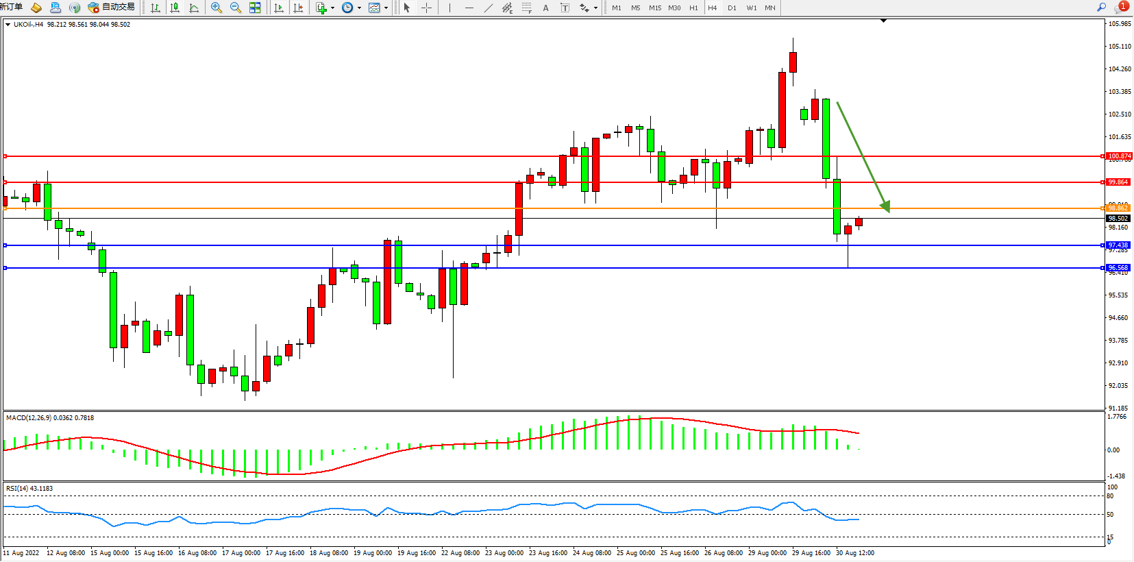 交易策略:98.862下方看跌,目标97.438、96.568