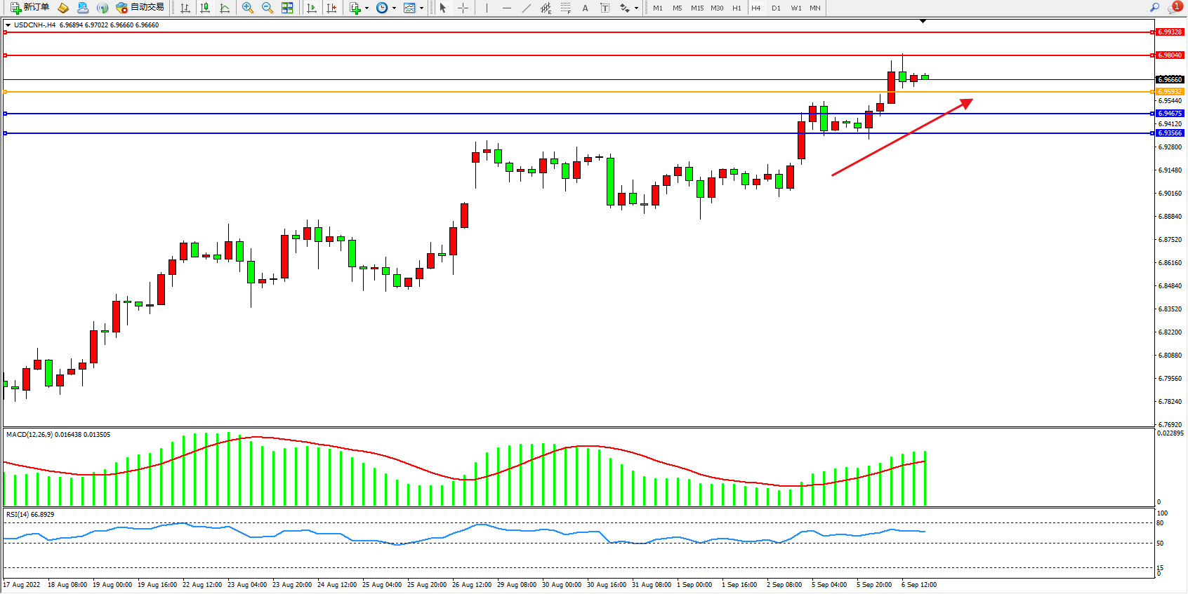 美元人民币USDCNH——4小时K线图显示: