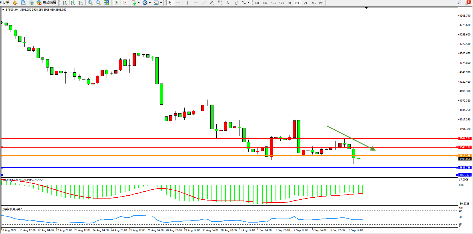 标普SP500——4小时K线图显示: