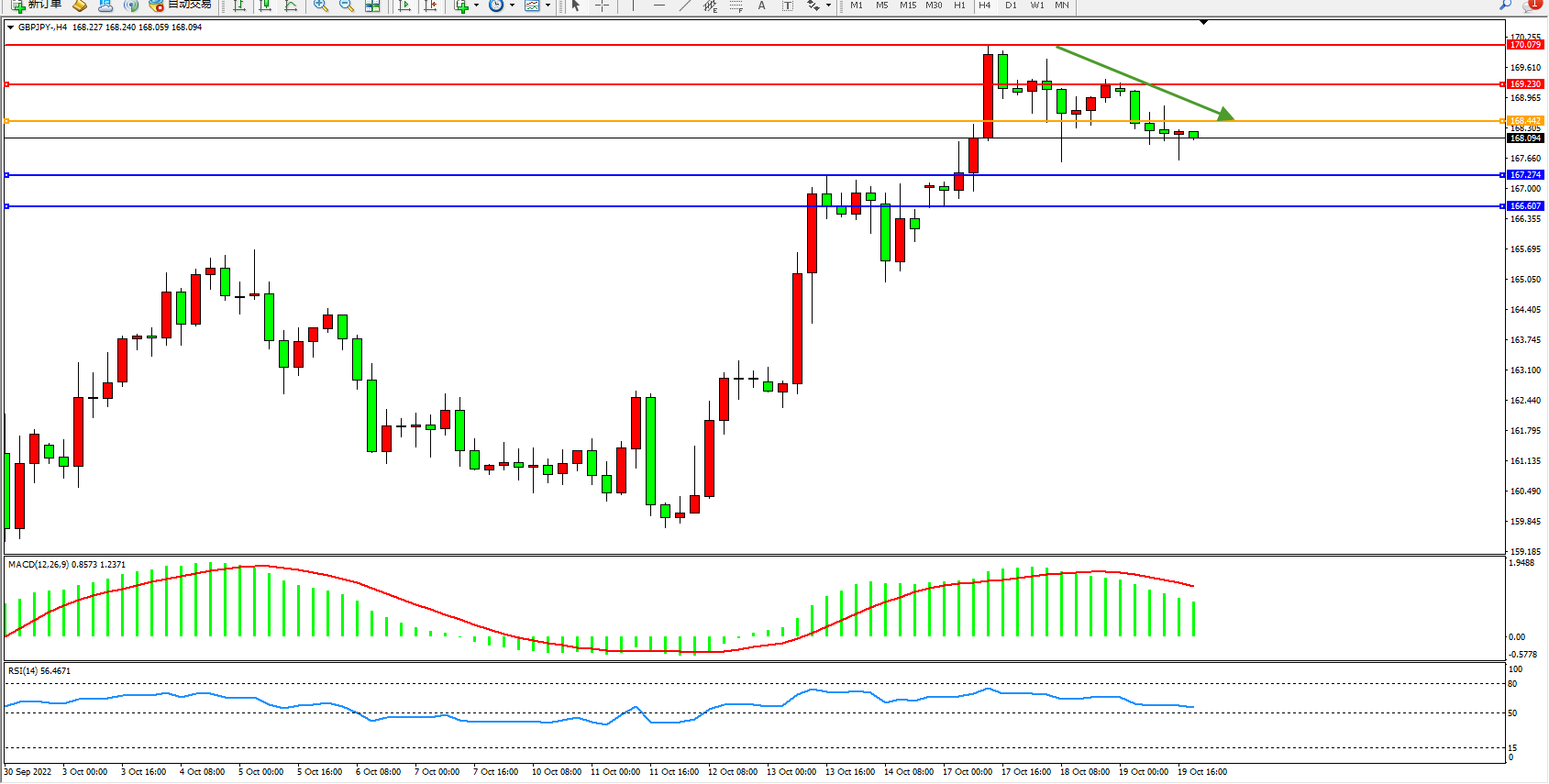 英镑兑日圆维持168.094附近震荡,英国9月核心CPI月率 0.6%,预期0.5%,前值0.8%。英国9月CPI年率录得10.1%,由于英国通胀年率再次达到两位数,CPI月率上涨了0.5%。这只会加重英国首相特拉斯政府的痛苦,因为在严冬到来之前,更高的物价压力依然存在,生活成本危机在未来几个月也将恶化。