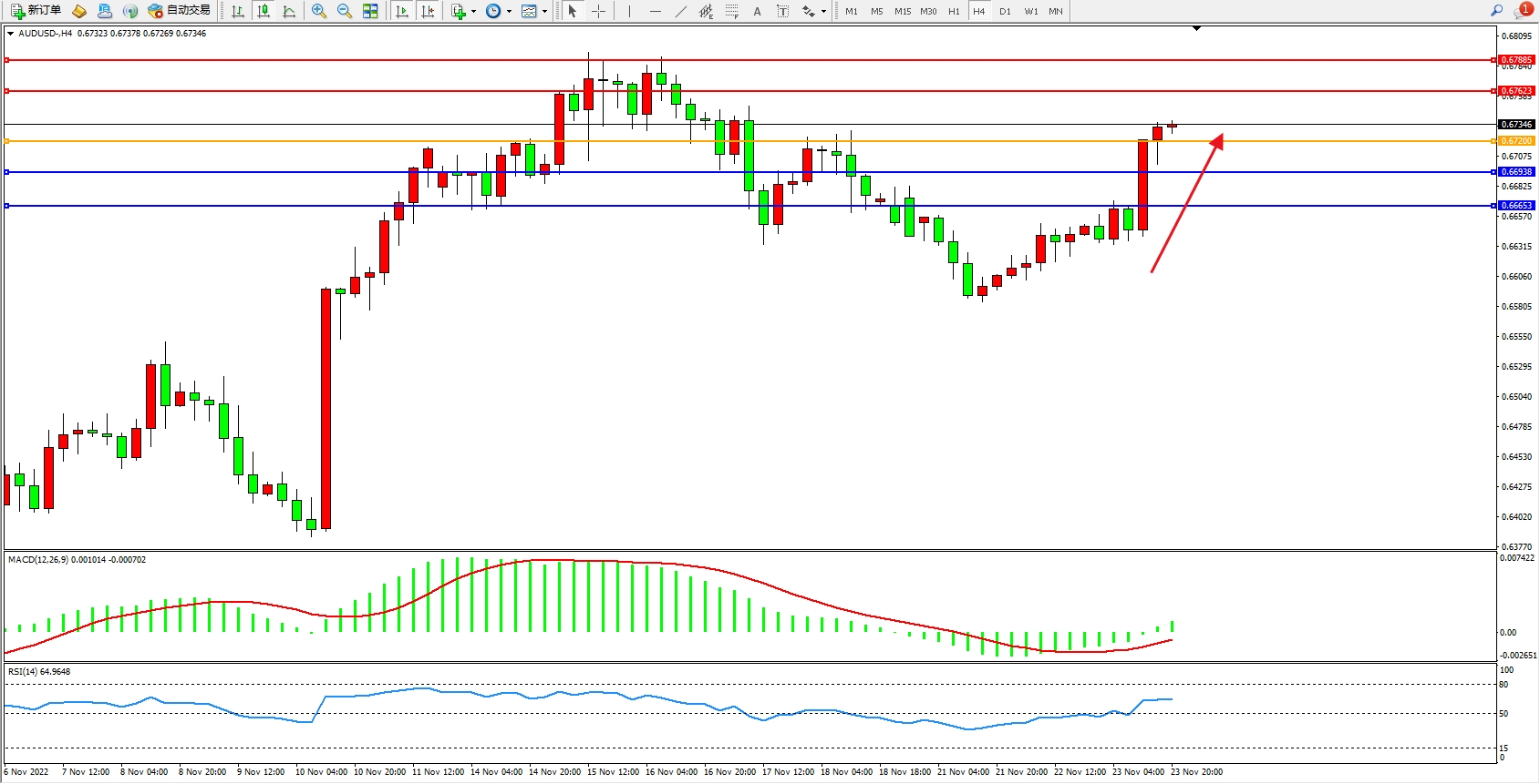 4小时图看:多头动力高位强势拉升上扬,短期看涨情绪涌现,市场多头有进一步向上拉升态势,MACD指标处于0轴线上側上移,RSI指标处于多头区域整理;