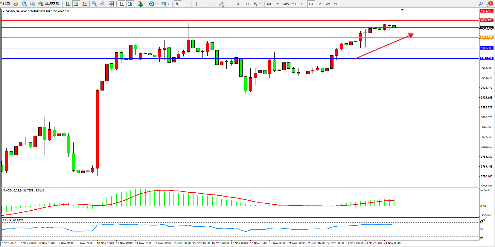 标普SP500——4小时K线图显示: