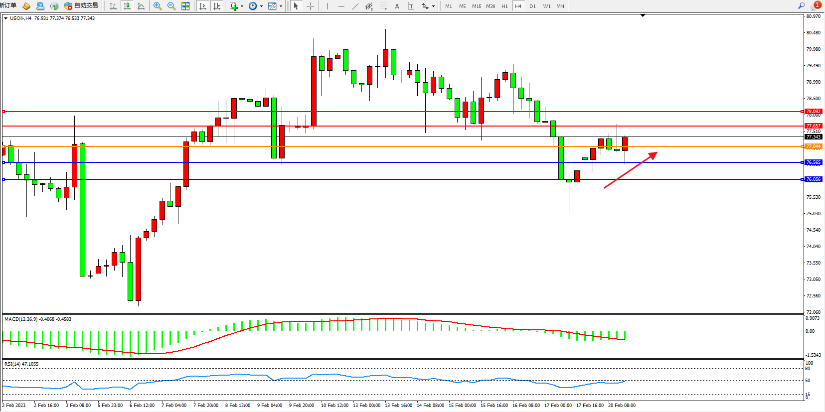 原油维持77.343附近震荡,中国的原油进口量将在2023年创下历史新高。高盛报告中称,未来的石油供应短缺可能会推动油价在今年年底达到每桶100美元。