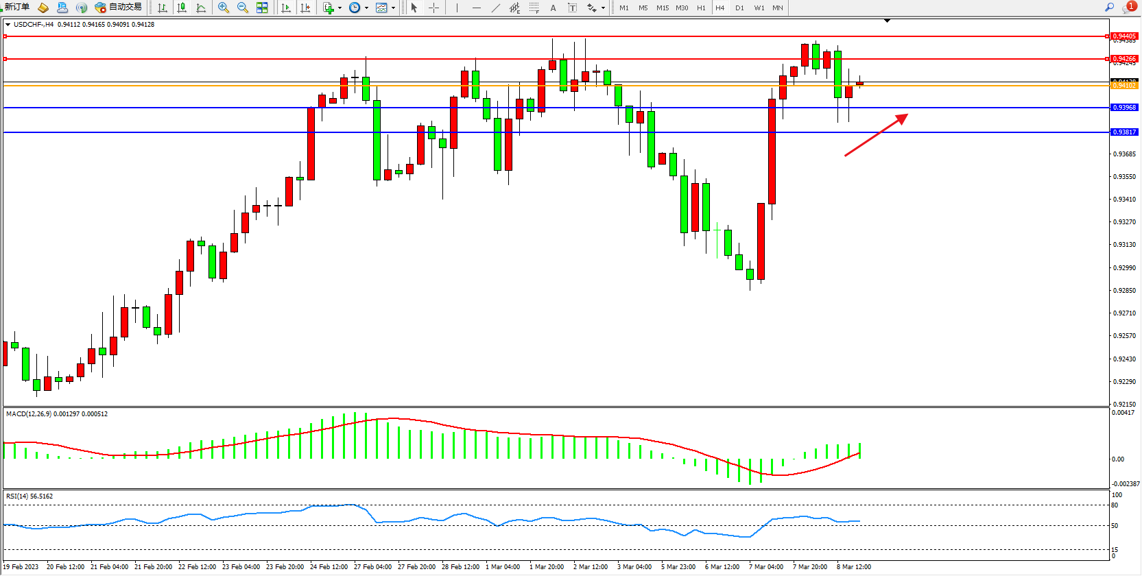 美元瑞郎USDCHF——4小时K线图显示: