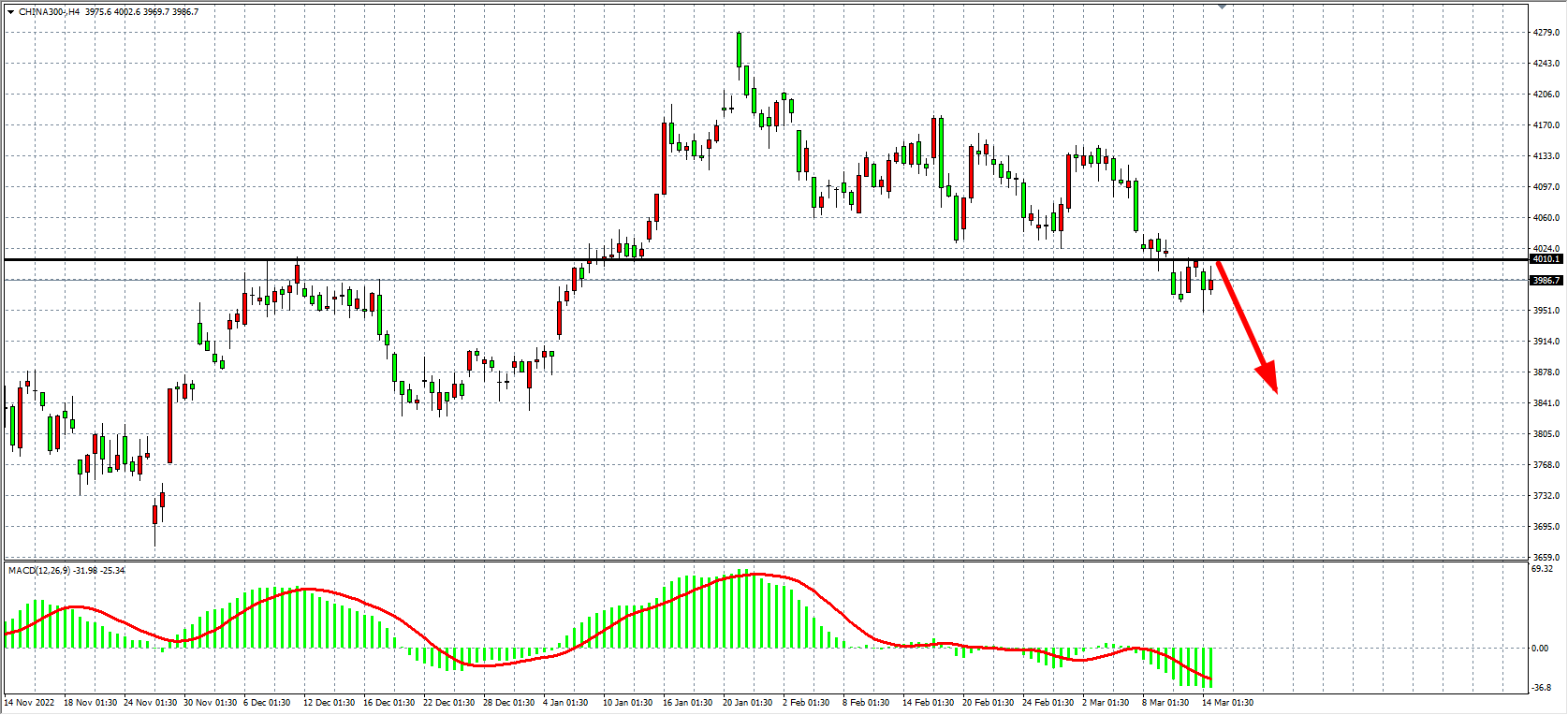 4小时图看,沪深300继续回落在4010之下运行,同时MACD于零轴之下再度放量,趋势偏向下行,4010之下继续以看空为主,下方目标3920-3850附近。