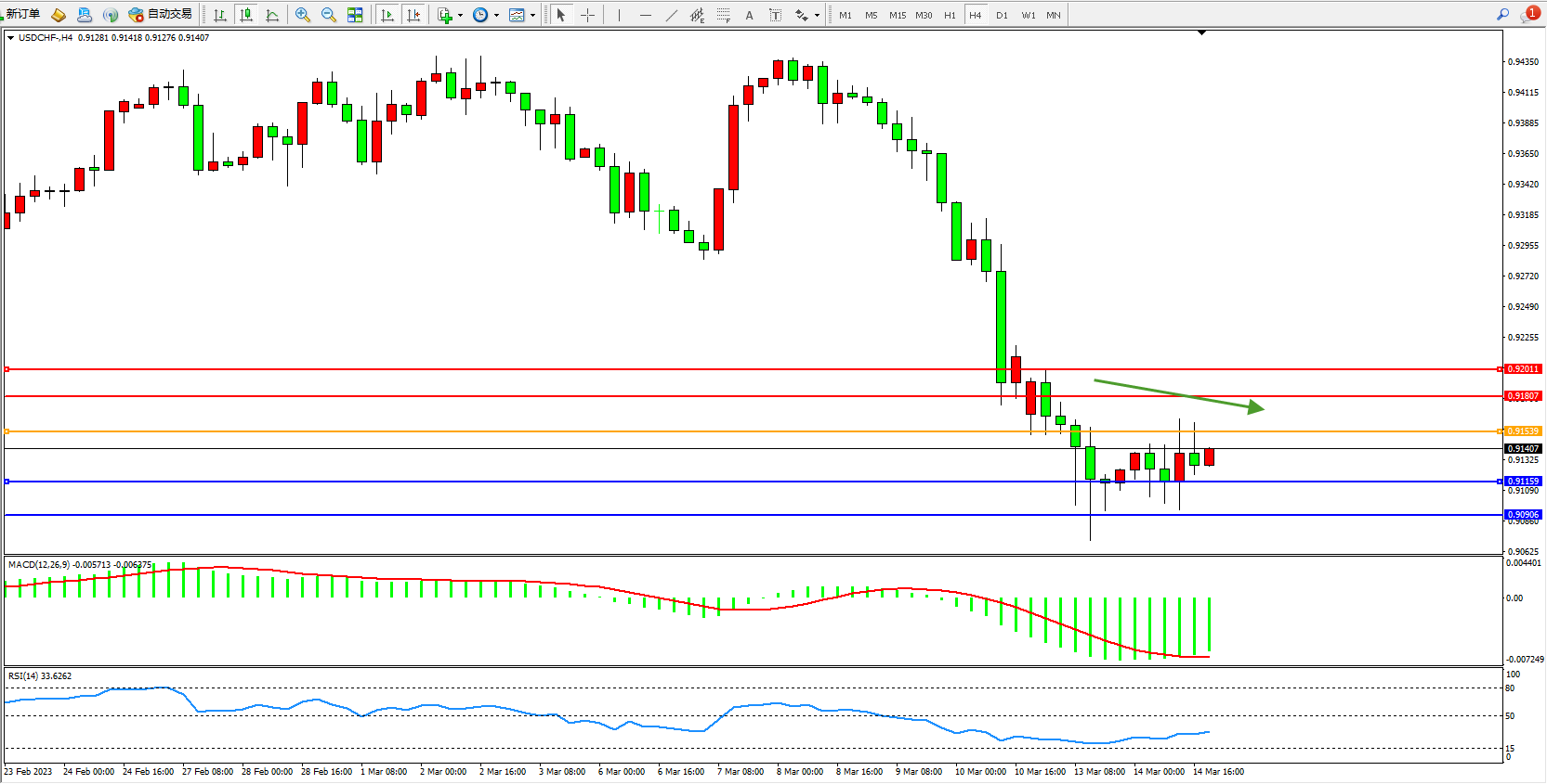 美元瑞郎USDCHF——4小时K线图显示: