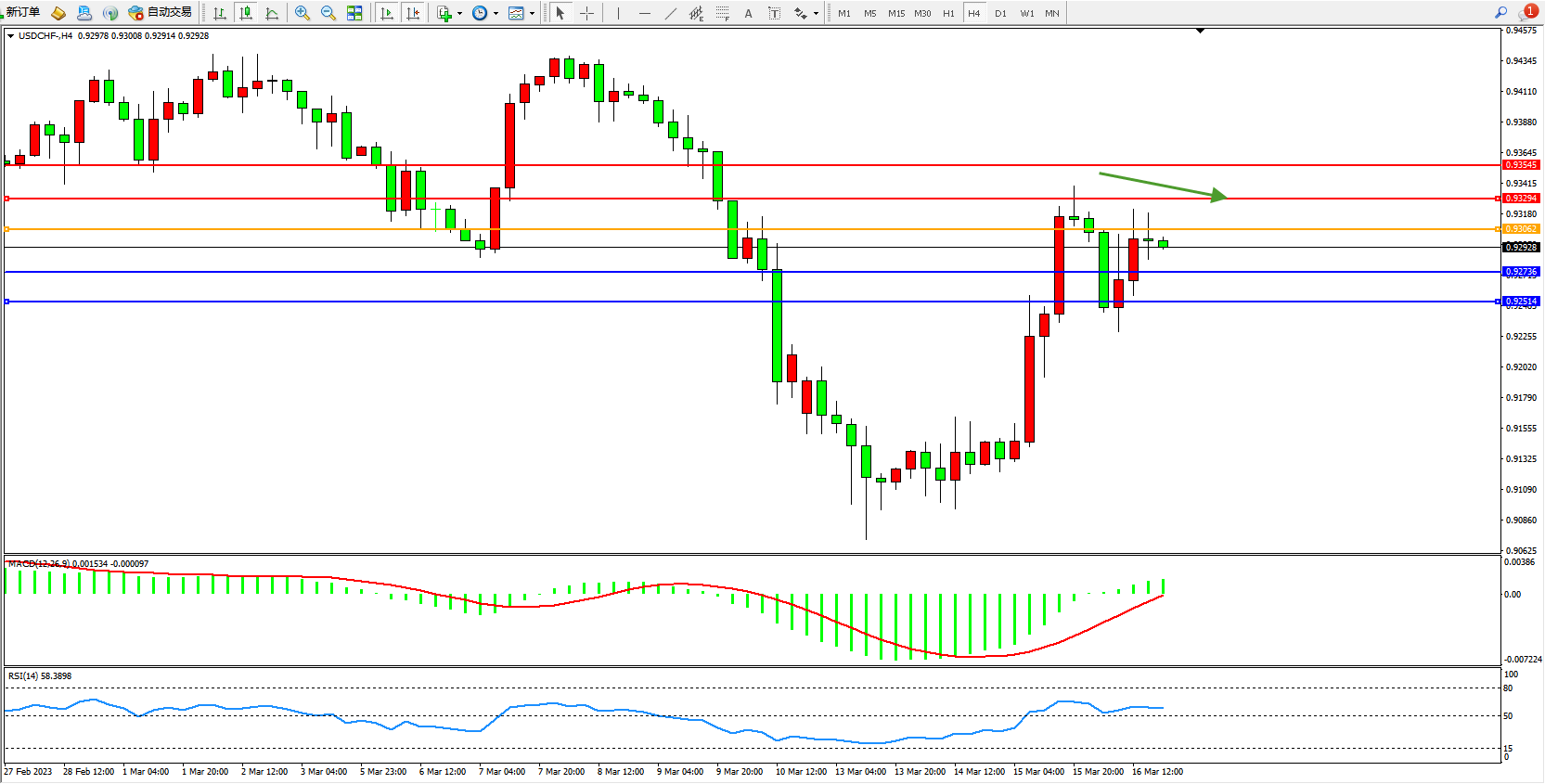交易策略:0.93062下方看跌,目标0.92736 0.92514