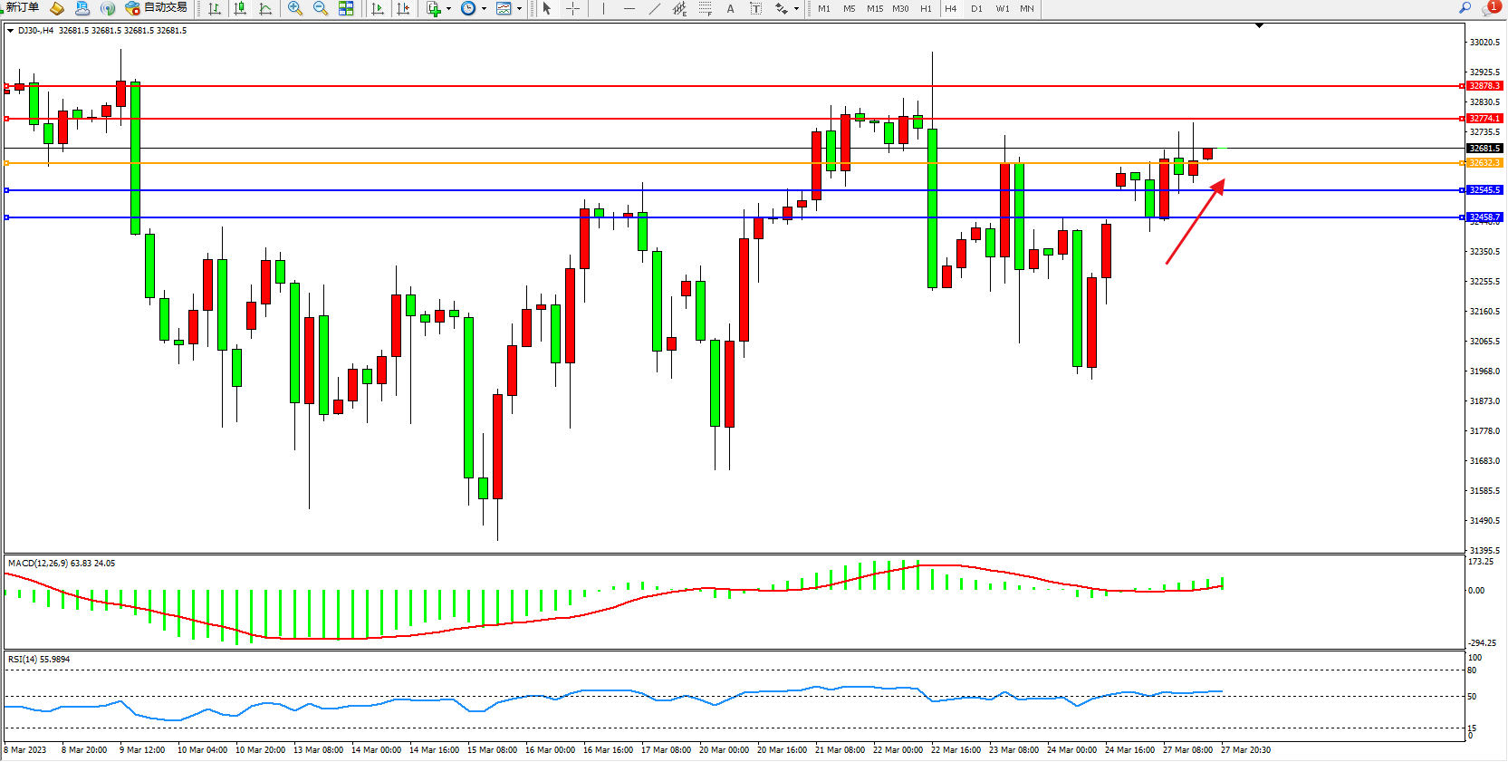 交易策略:32632上方看涨,目标32774  32878