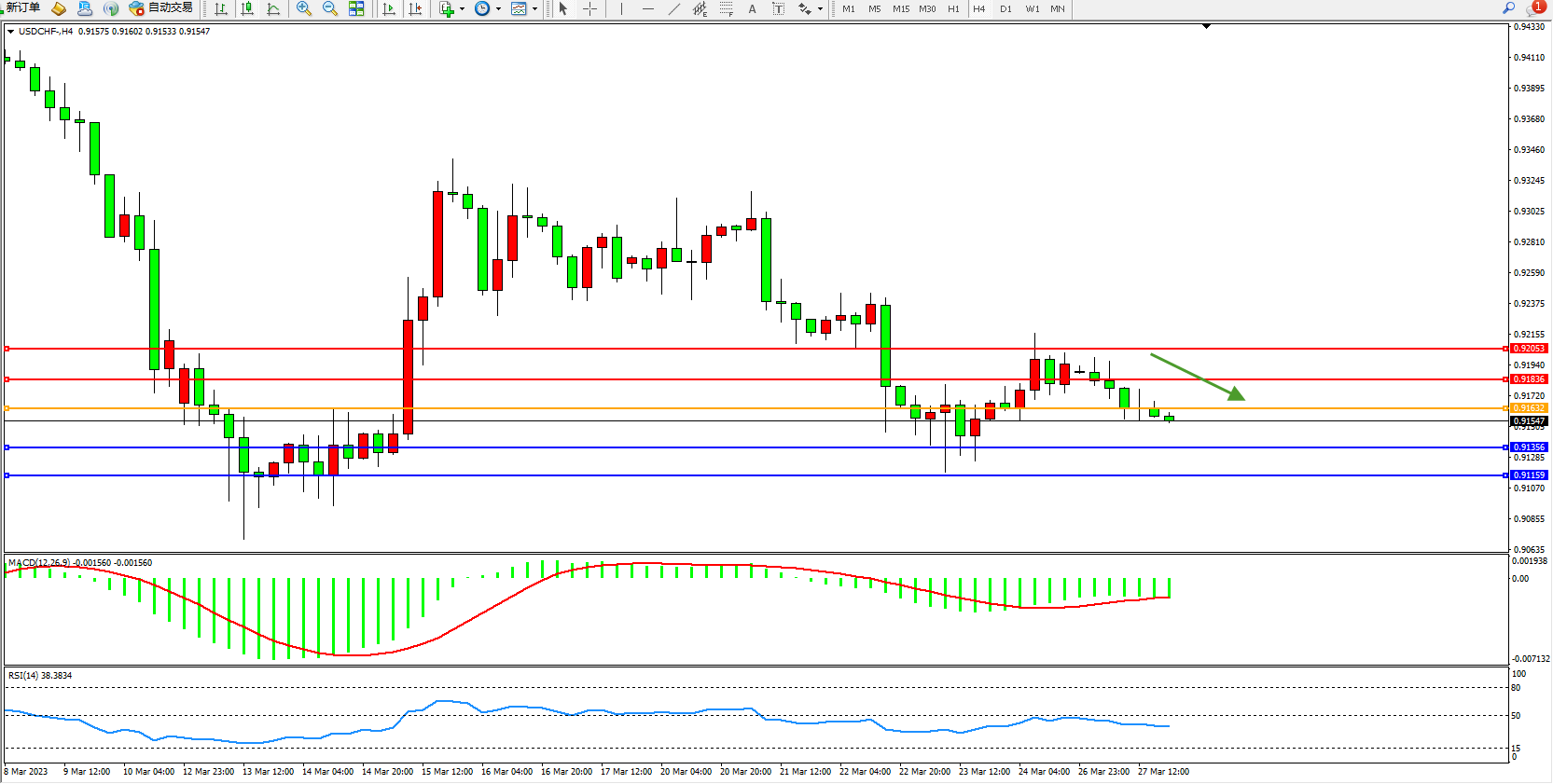 美元瑞郎USDCHF——4小时K线图显示: