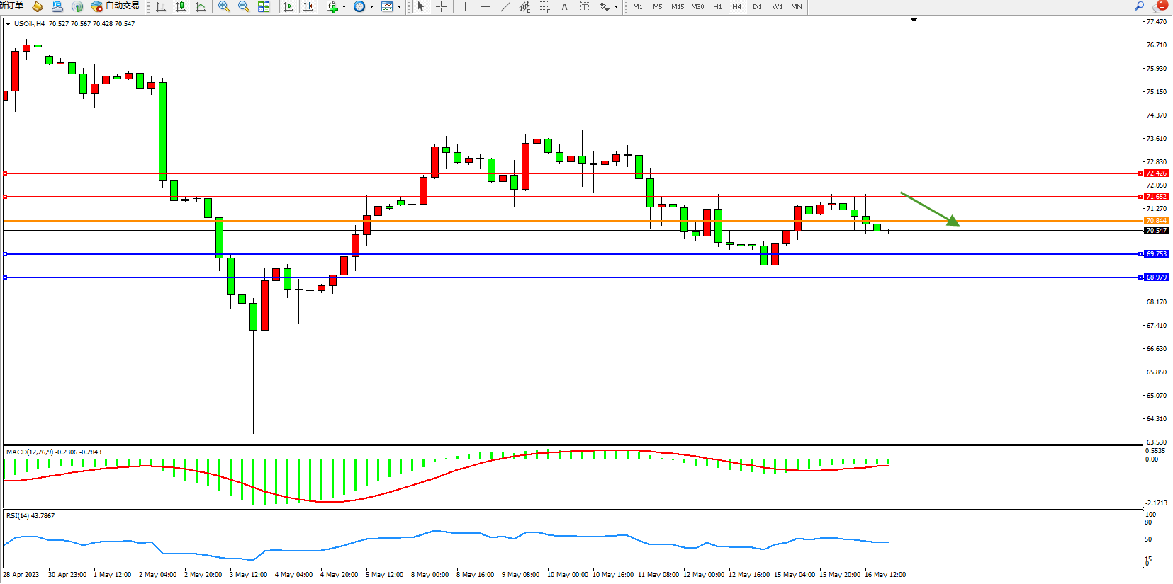 交易策略:70.844下方看跌,目标69.753 68.979