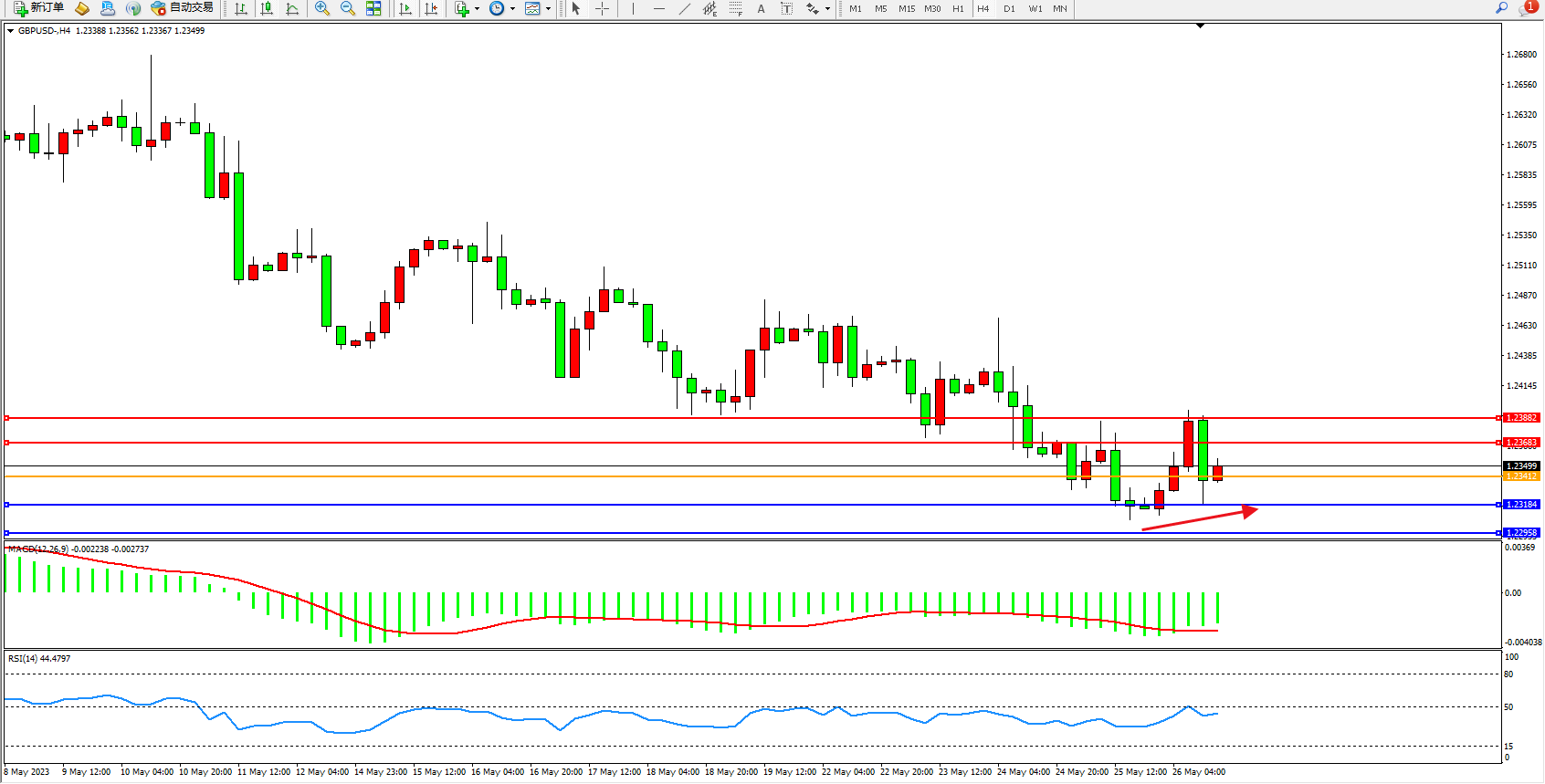 备选策略:1.23412下方看跌,目标1.23184 1.22958