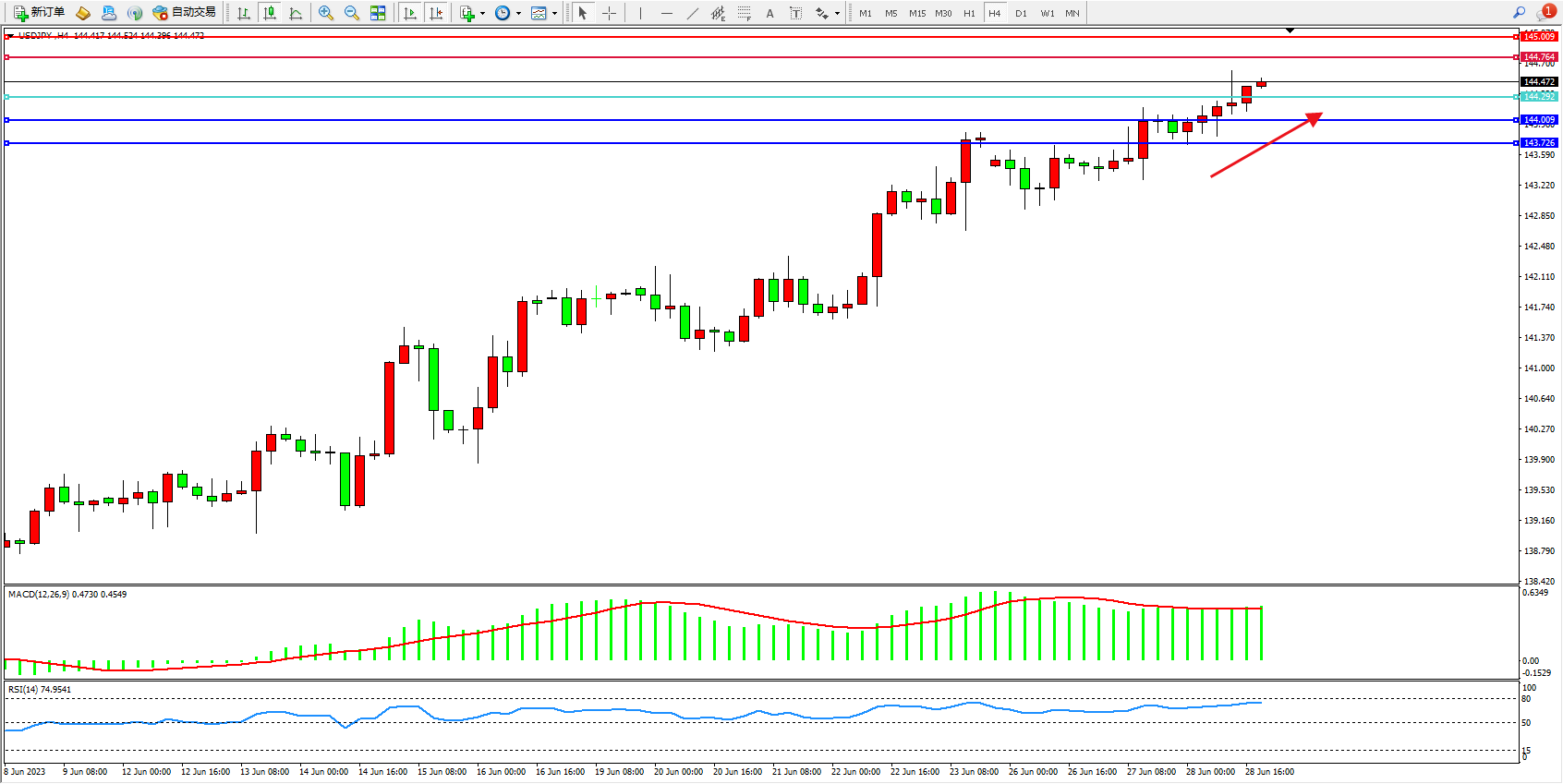 交易策略:144.292上方看涨,目标144.764 145.009
