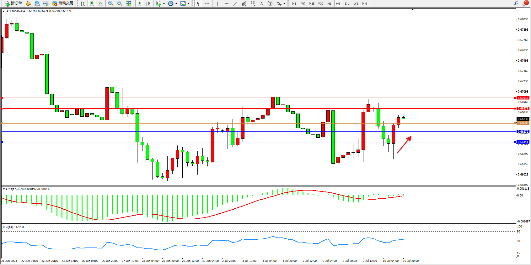 交易策略:0.66683上方看涨,目标0.66873  0.67010