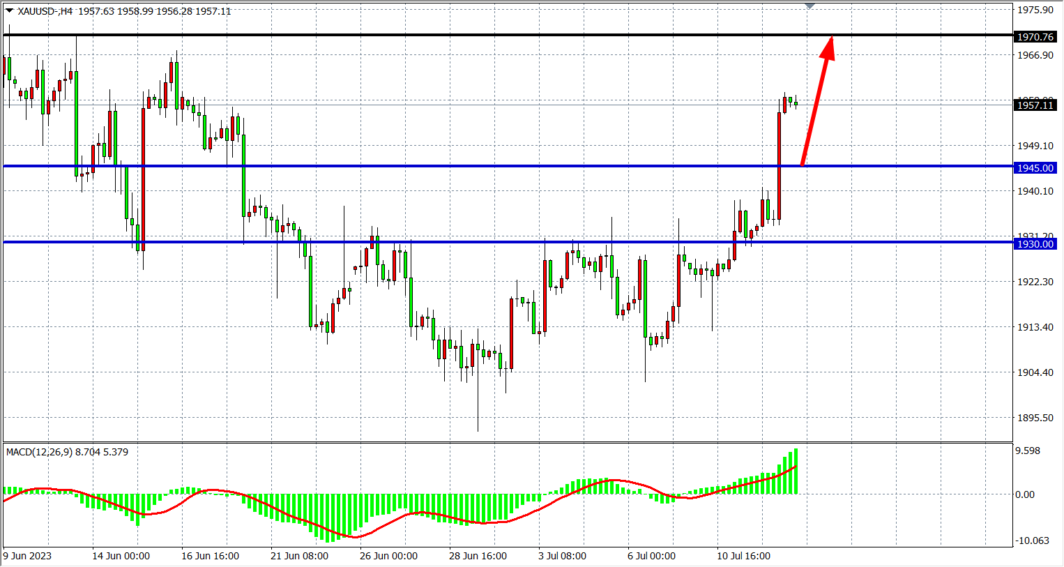 4小时图看,黄金大涨接连上破阻力,MACD量能在零轴上放量,行情上行趋势明显,支撑上移1945-1950附近,上方阻力关注1970-1983。