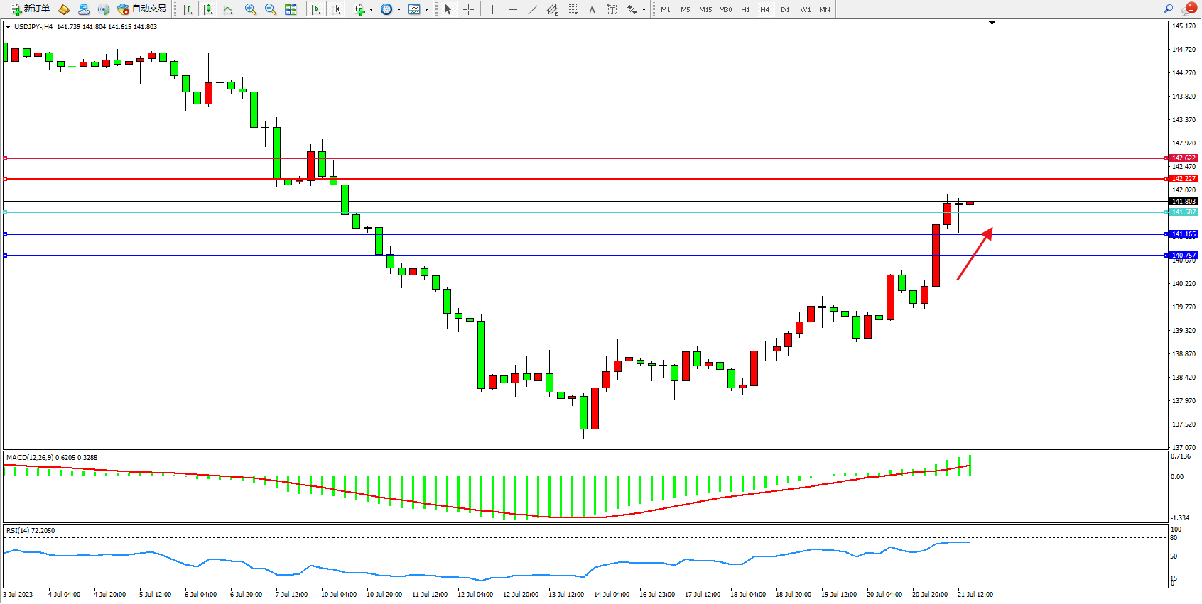 交易策略:141.587上方看涨,目标142.227 142.622