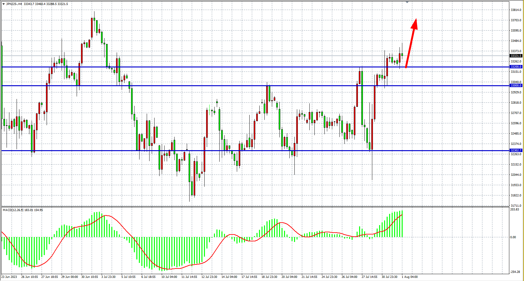 4小时图看,日经指数维持在33200关口上,MACD量能在零轴之上有序放量,多头趋势延续,支撑关注33200-33000,该位之上看33500-33800。