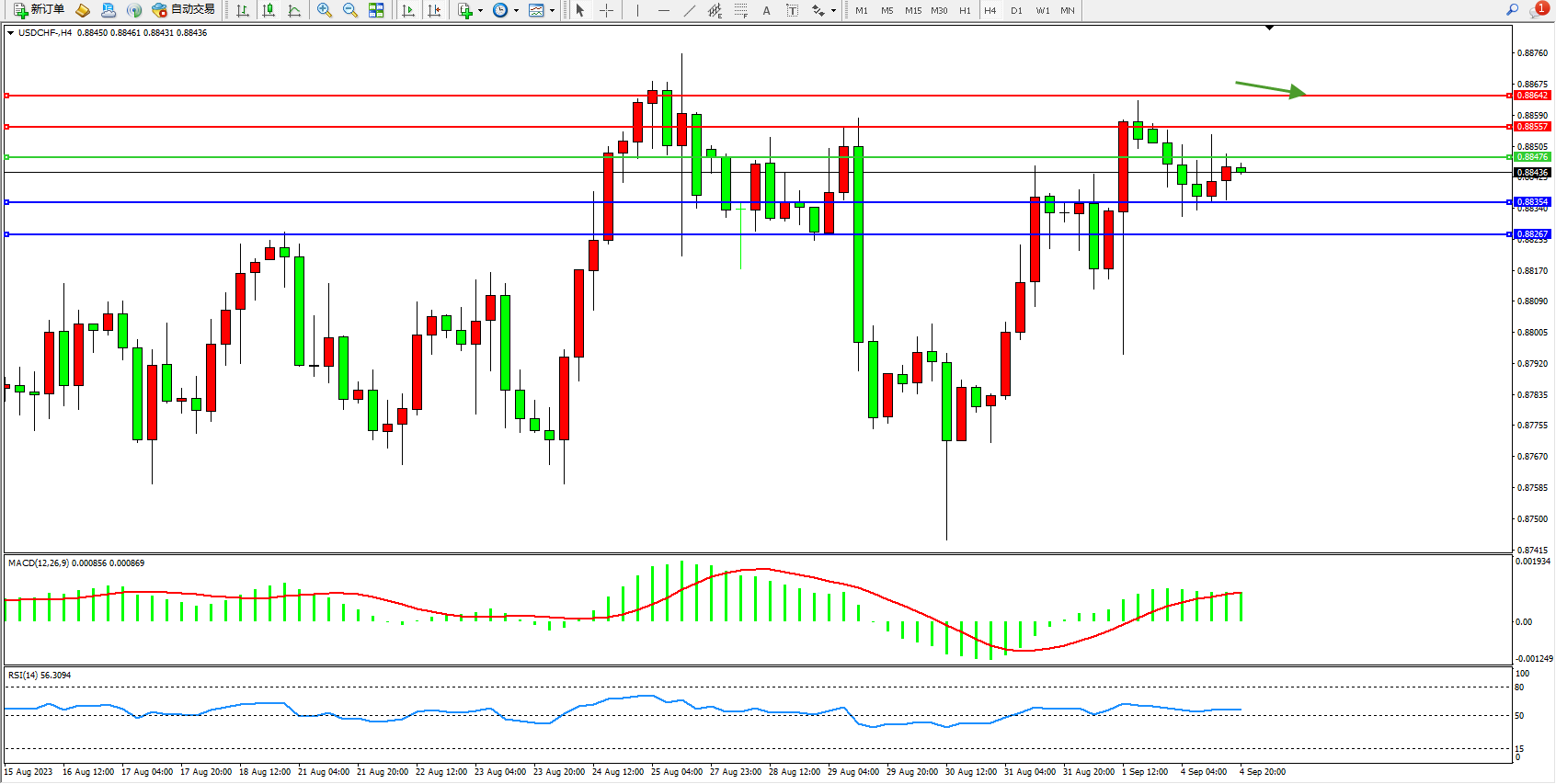 美元瑞郎USDCHF——4小时K线图显示: