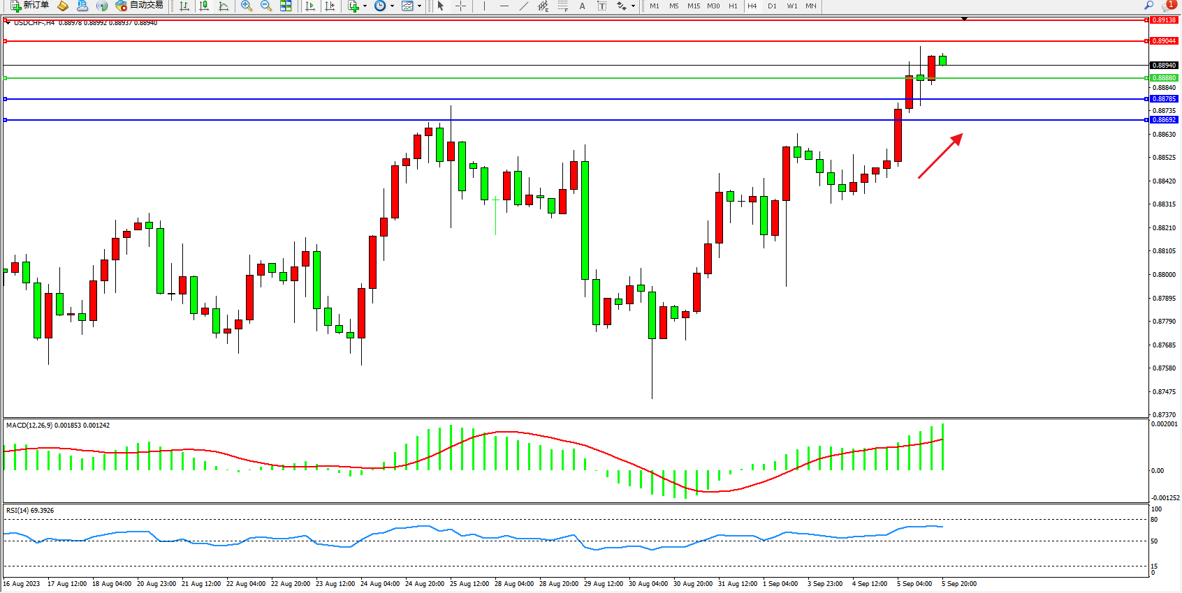 美元瑞郎USDCHF——4小时K线图显示: