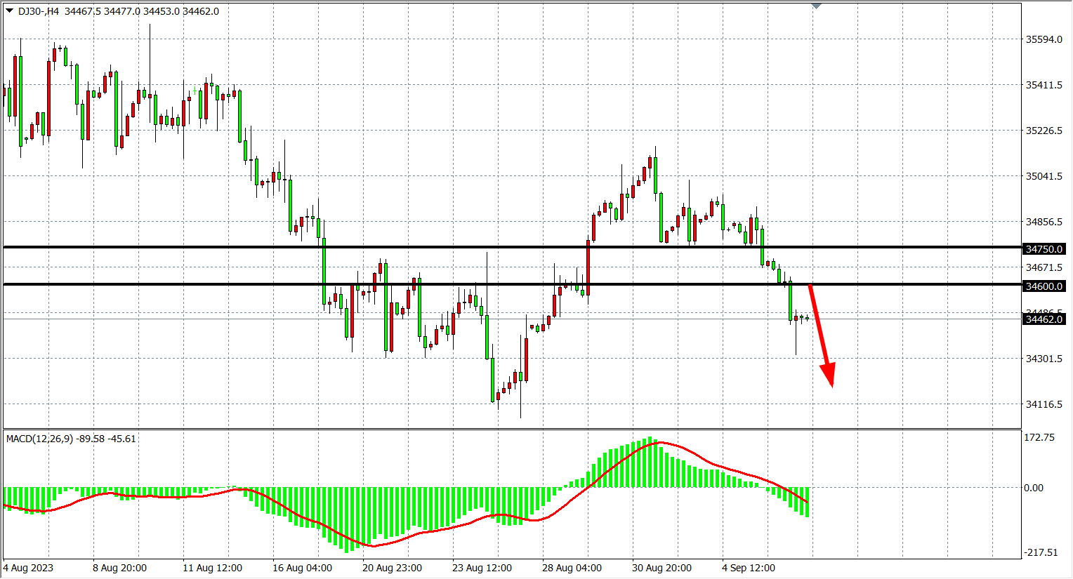 4小时图看,道指进一步走低至34300附近,MACD量能下穿零轴之下,空头走势延续,阻力下移34600-34750附近,下方看34200-34000附近。