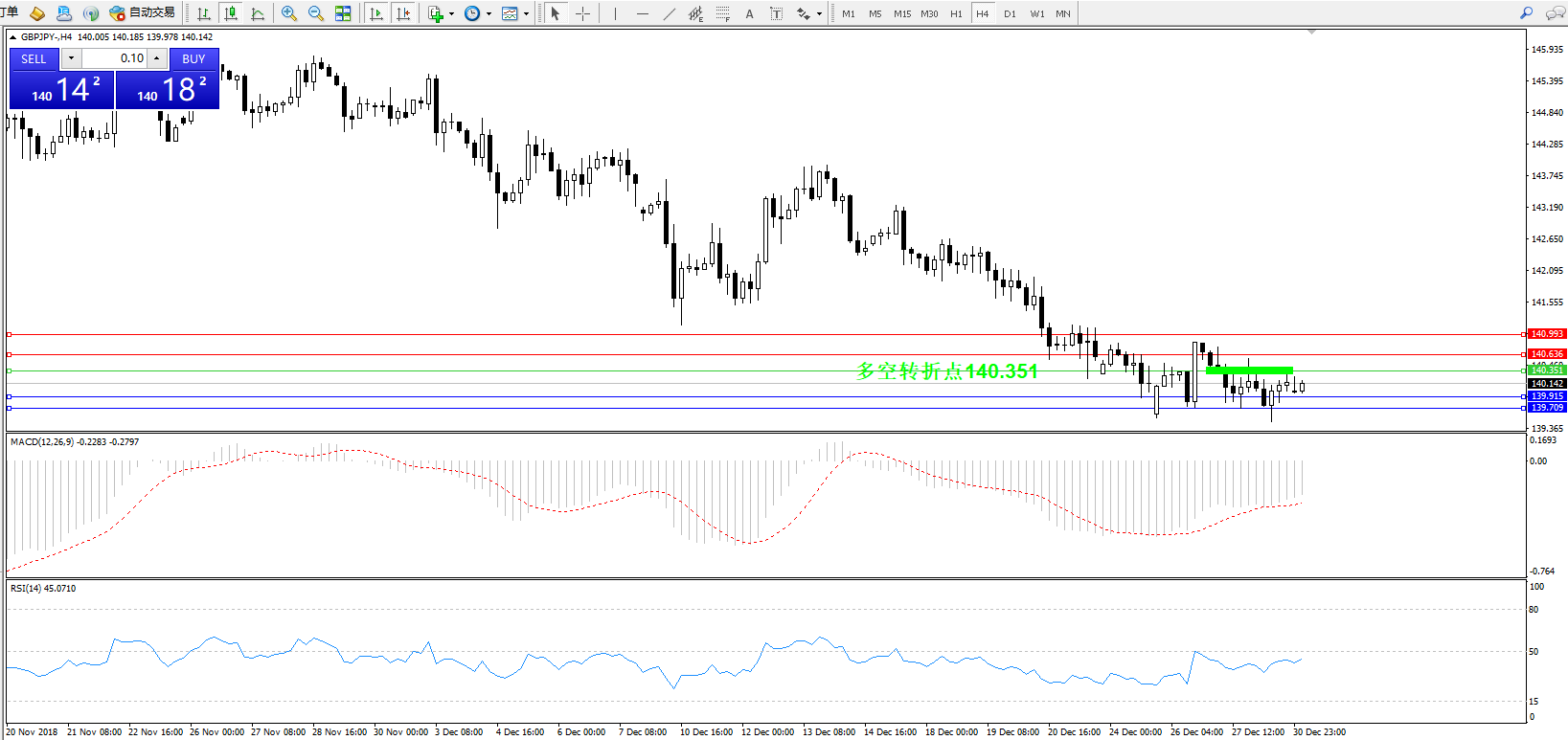 交易策略:140.351下方看跌,目标139.915、139.709