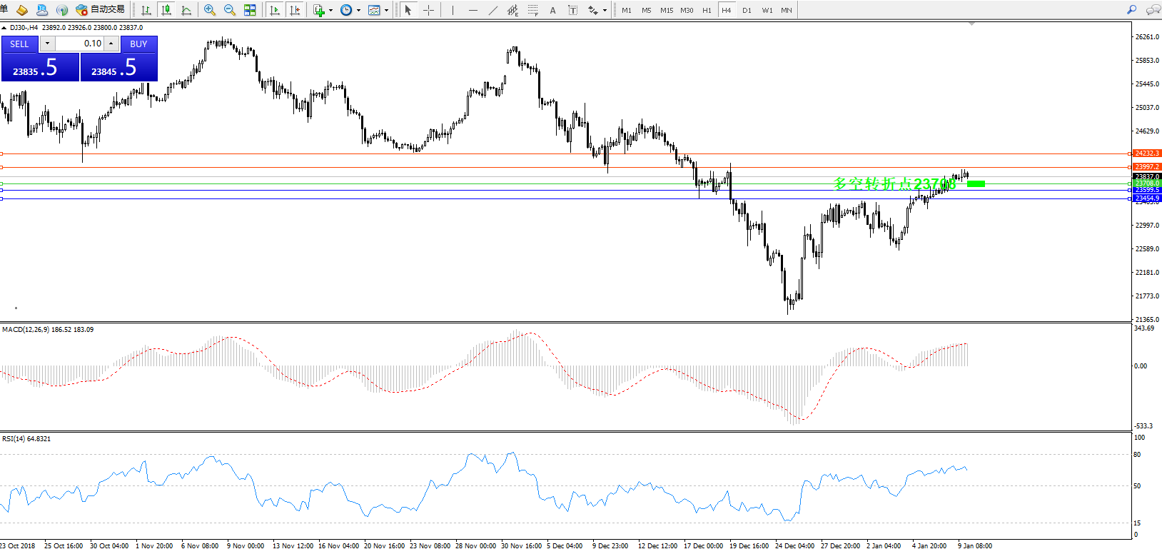 道琼斯指数DJ30—— 4小时K线图显示: