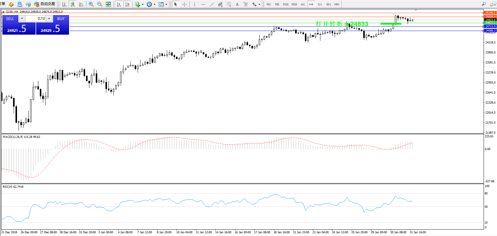 道琼斯指数DJ30—— 4小时K线图显示: