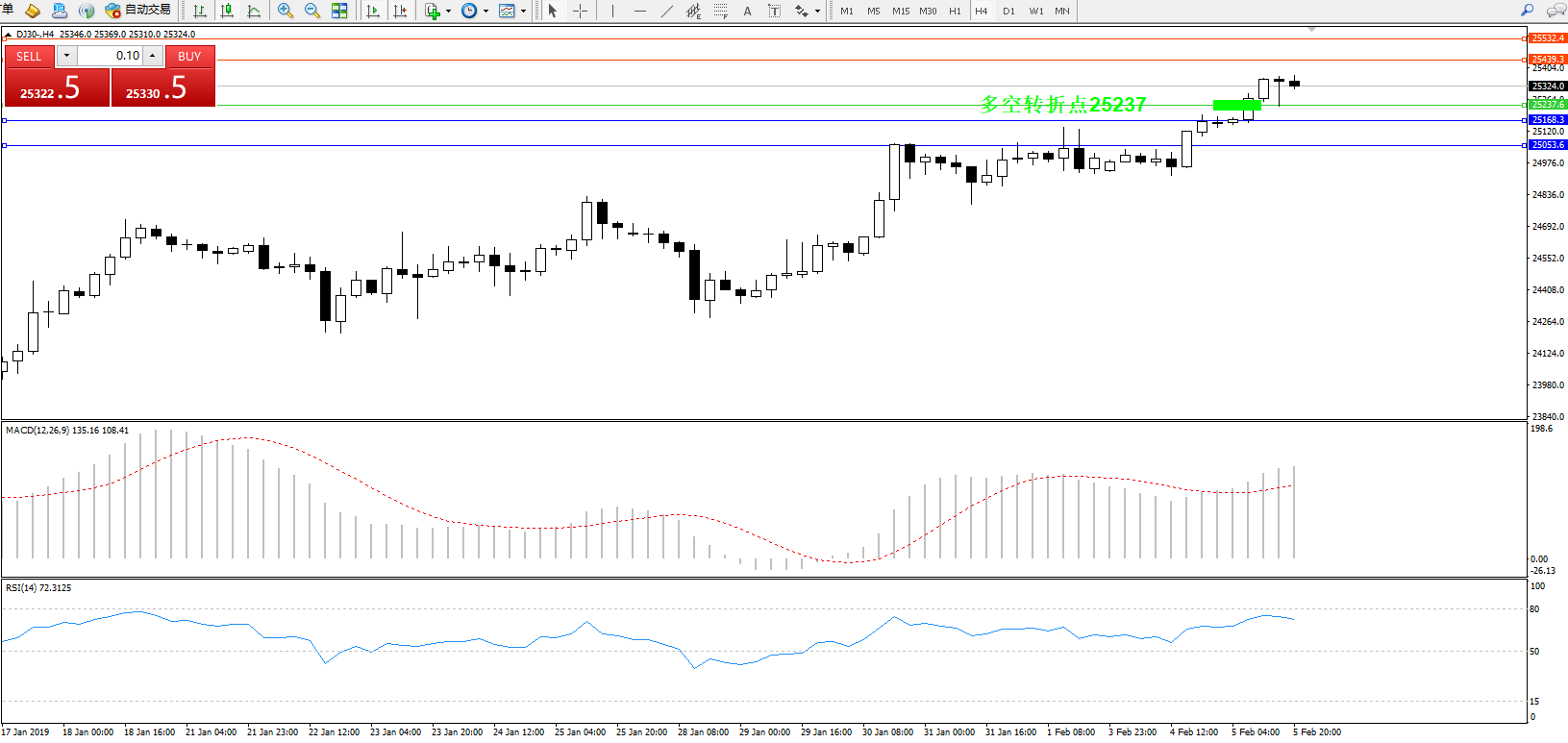道琼斯指数DJ30—— 4小时K线图显示: