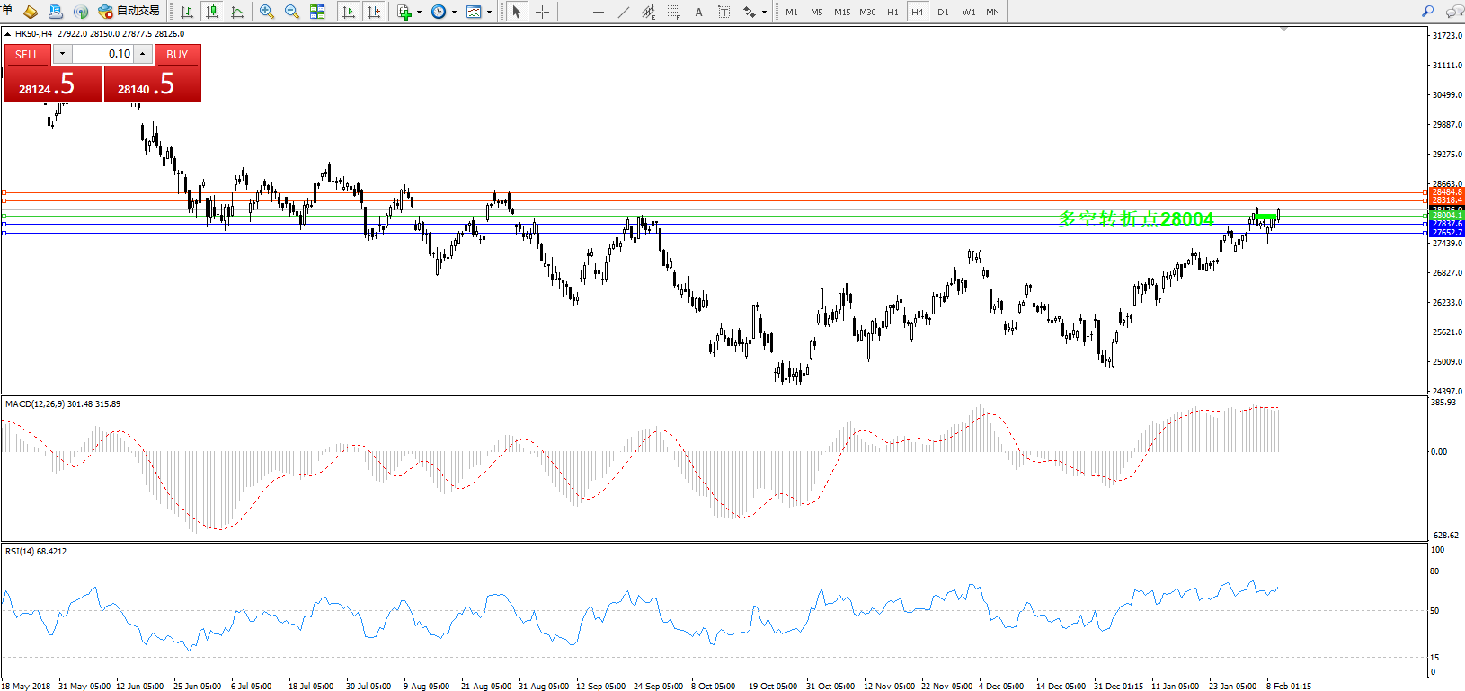 恒指HK50 ——4小时K线图显示: