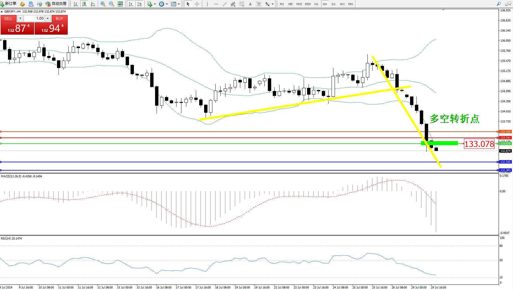 交易策略:133.078下方看跌,目标132.545、132.303