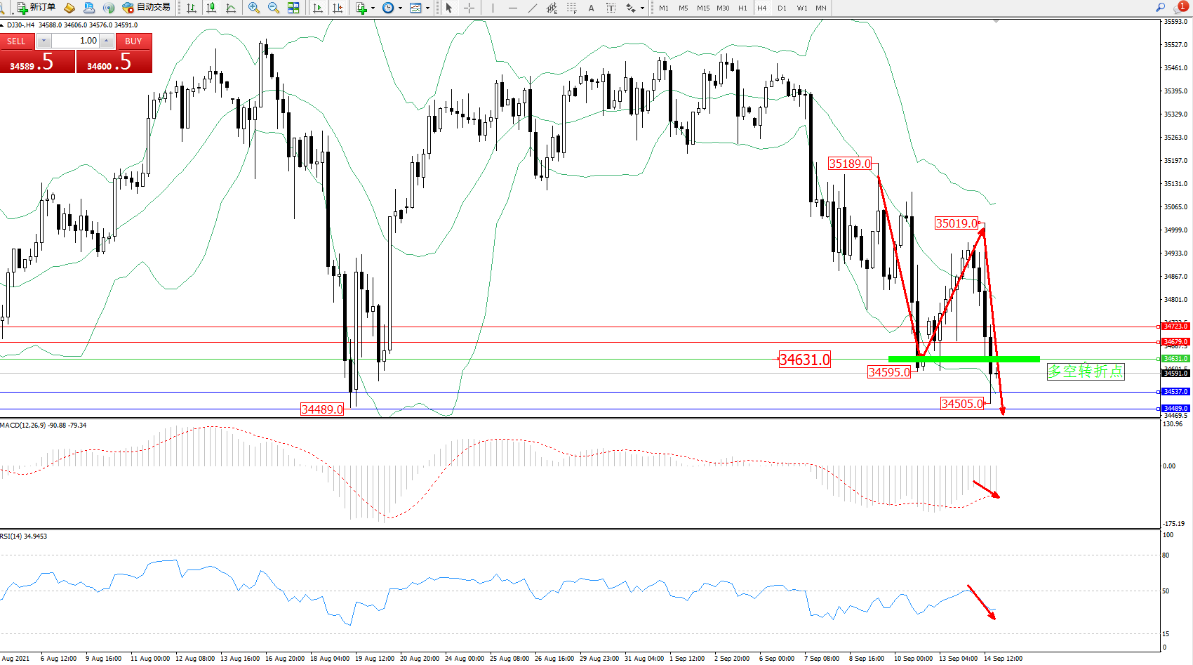 交易策略:34631下方看跌,目标34537、34489