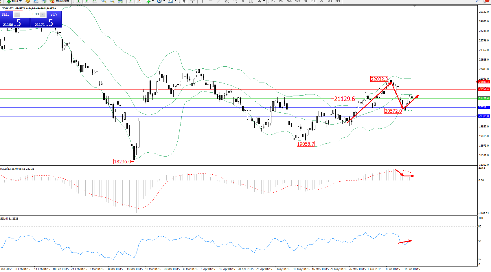 技术点评:多头动力延续布林带指标通道中上轨区间节点持续震荡上扬,高位抵达22032附近节点遇阻回撤,触及下轨20572附近得到支撑反转再度拉升,处于布林带指标中轨下侧整理,短期多头动力有继续上移迹象,布林带指标呈收口走势持续平移中,MACD指标处于多头区域缓慢回撤后开始平移,RSI指标处于50均衡线附近窄幅整理上移;