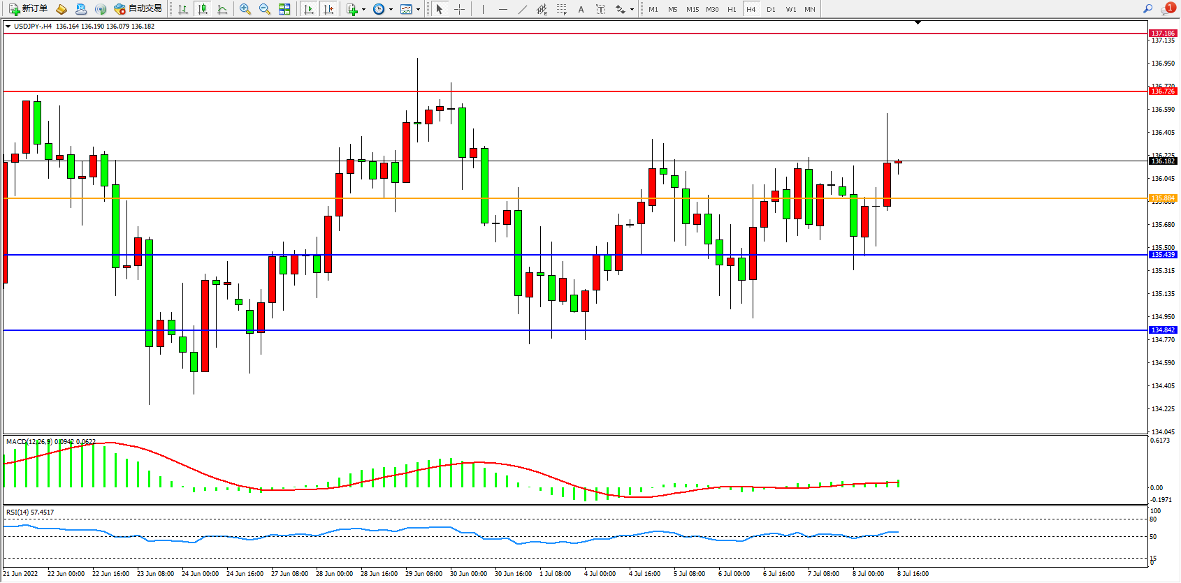 4小时图看:长时间窄幅区间震荡上移,波幅空间逐渐收窄,MACD指标处于0轴线附近弱势徘徊,RSI指标处于50均衡线上側窄幅整理;