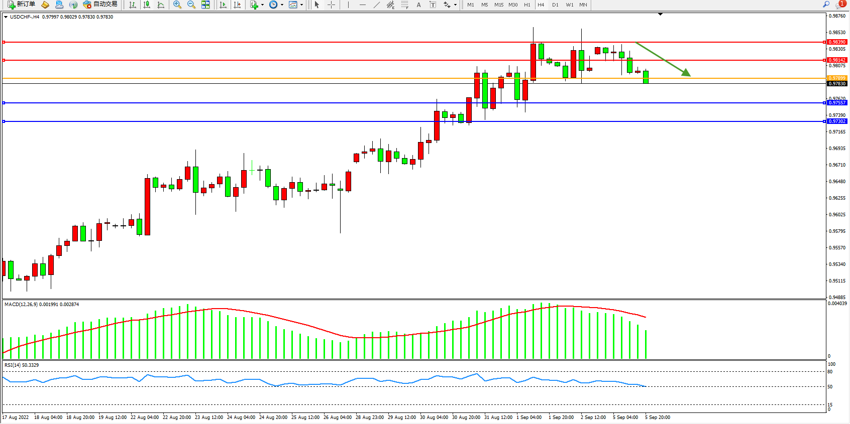美元瑞郎USDCHF——4小时K线图显示: