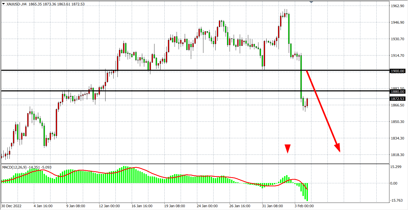 交易策略:在1900.00 之下看跌,目标1860.00         1840.00
