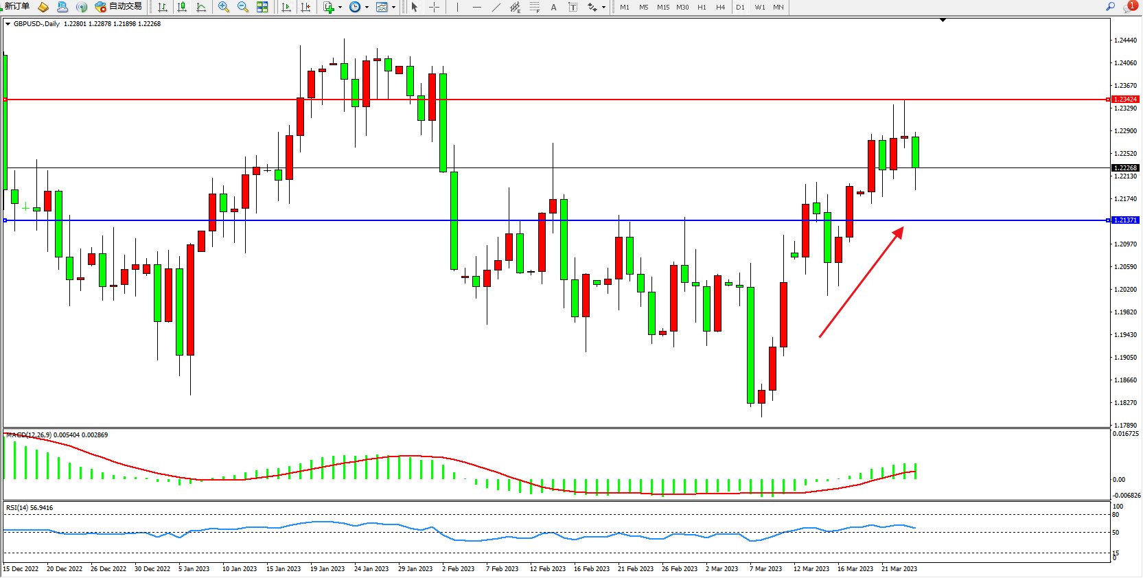 多头动力维持震荡持续向上移动,短期看涨情绪依旧,上方压制关注1.23424附近,低位支撑关注1.21371附近,市场整体多头不断攀升,MACD指标处于多头区域维持整理,RSI指标处于50均衡线上侧徘徊,如图: