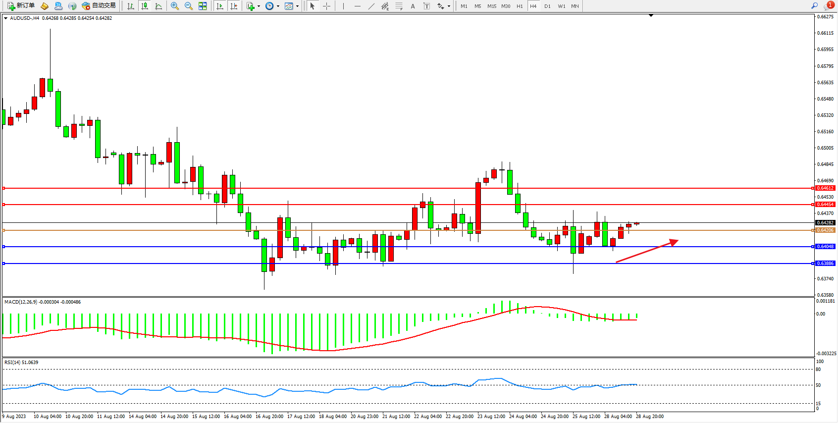备选策略:0.64206下方看跌,目标0.64048  0.64048
